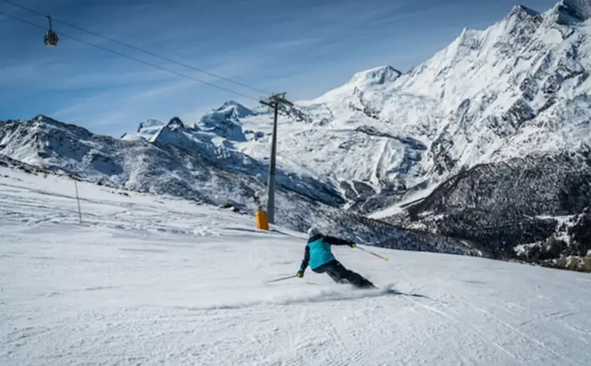 Starting high above the Saas-Fee ski area (Mittelallalin / Felskinn) down toward the village; it’s long, scenic, and usually quite reliable snow.