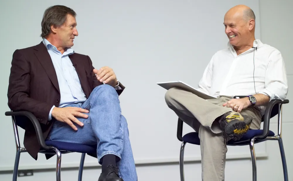 Frank ‘Scoop’ Baldwin interviews Austria’s Olympic and World Cup ski racing legend Franz Klammer on stage.