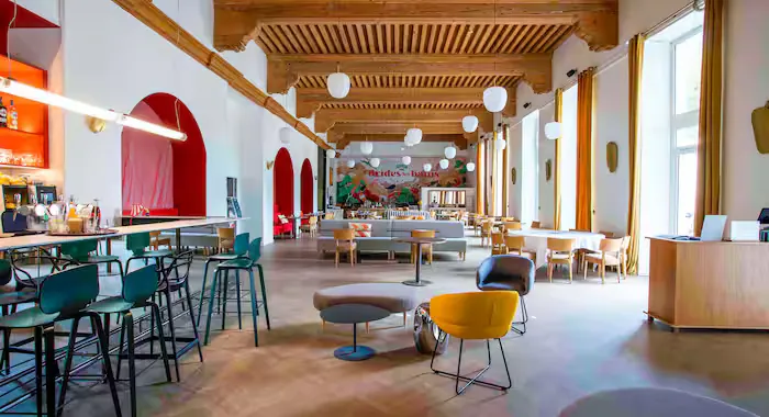 Design-wise, the hotel embraces a bold, eclectic style with a playful twist. The reception area features black-and-white checked floors, vibrant colours and retro prints that channel a 1930s art deco vibe – but with a modern, fun edge. Think grand columns meets funky flair. And upstairs, the rooms are a real talking point. Quirky and colourful, they're all bold reds and blues, ski-themed artwork and unexpected touches like disco balls. They've really mastered that mix of retro charm and contemporary comfort here.